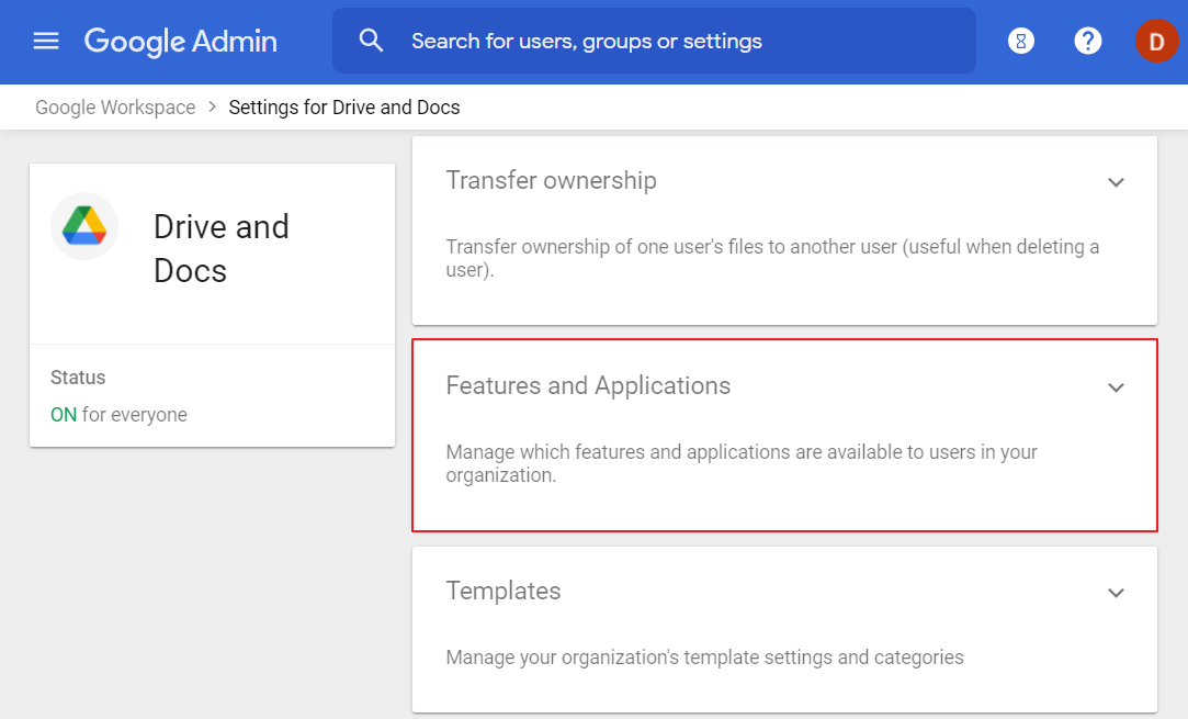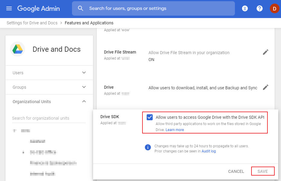 - Click on the Drive SDK section and tick Allow users to access Google Drive with the Drive SDK API. Click SAVE.