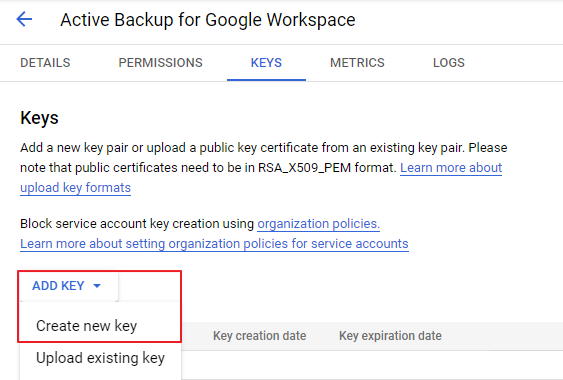 - Now you can use the locally-stored key (generated in step 14) to create a task in Active Backup for Google Workspace. This article will guide you through the steps.