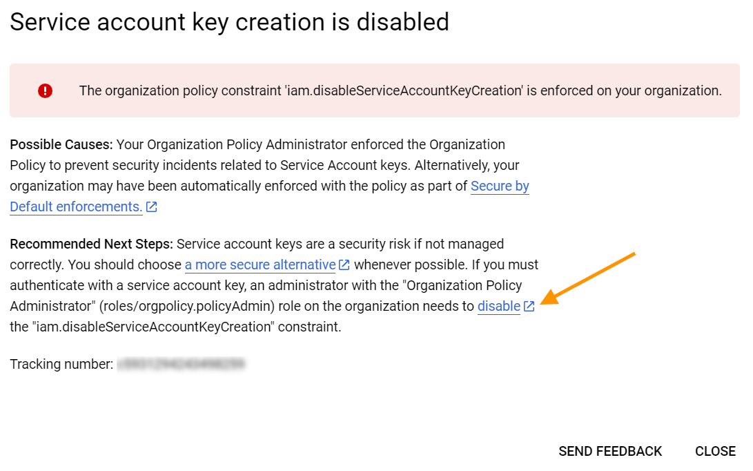 If you see the window below, click the "disable" link as shown in the screenshot or go to Navigation Menu > Organization Policies and find Disable service account key creation. Set the policy to Inactive. Once completed, return to the Service Accounts tab.