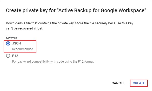 - In the pop-up window, choose JSON as the key type and click CREATE.